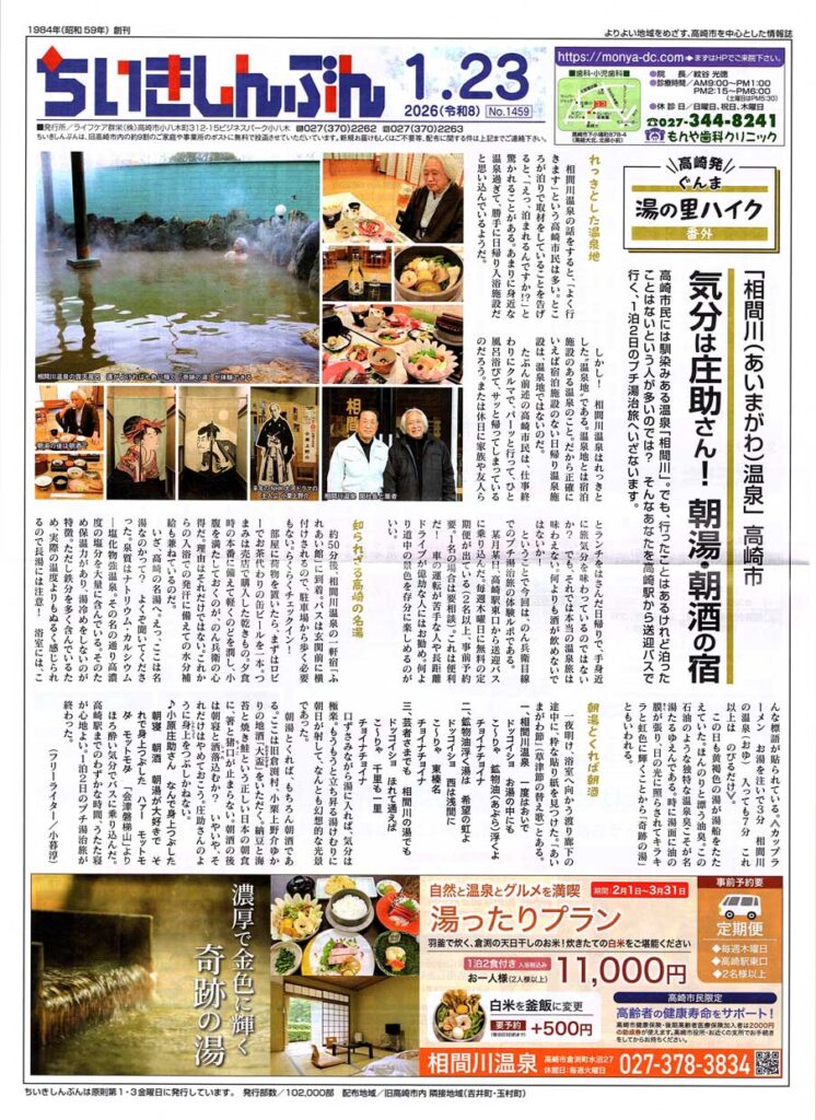 令和8年1月23日号のちいきしんぶん一面に当館のことが紹介されています。有名な温泉ラーターの小暮淳さんが宿泊体験記を書いてくれました(^_-)-☆ 2月3月宿泊プランのご案内もぜひご覧ください。